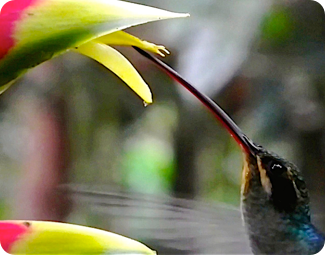 What a bill! A Green Hermit (Phaethornis guy) feeding from a lobster claw flower (Heliconia rostrata).